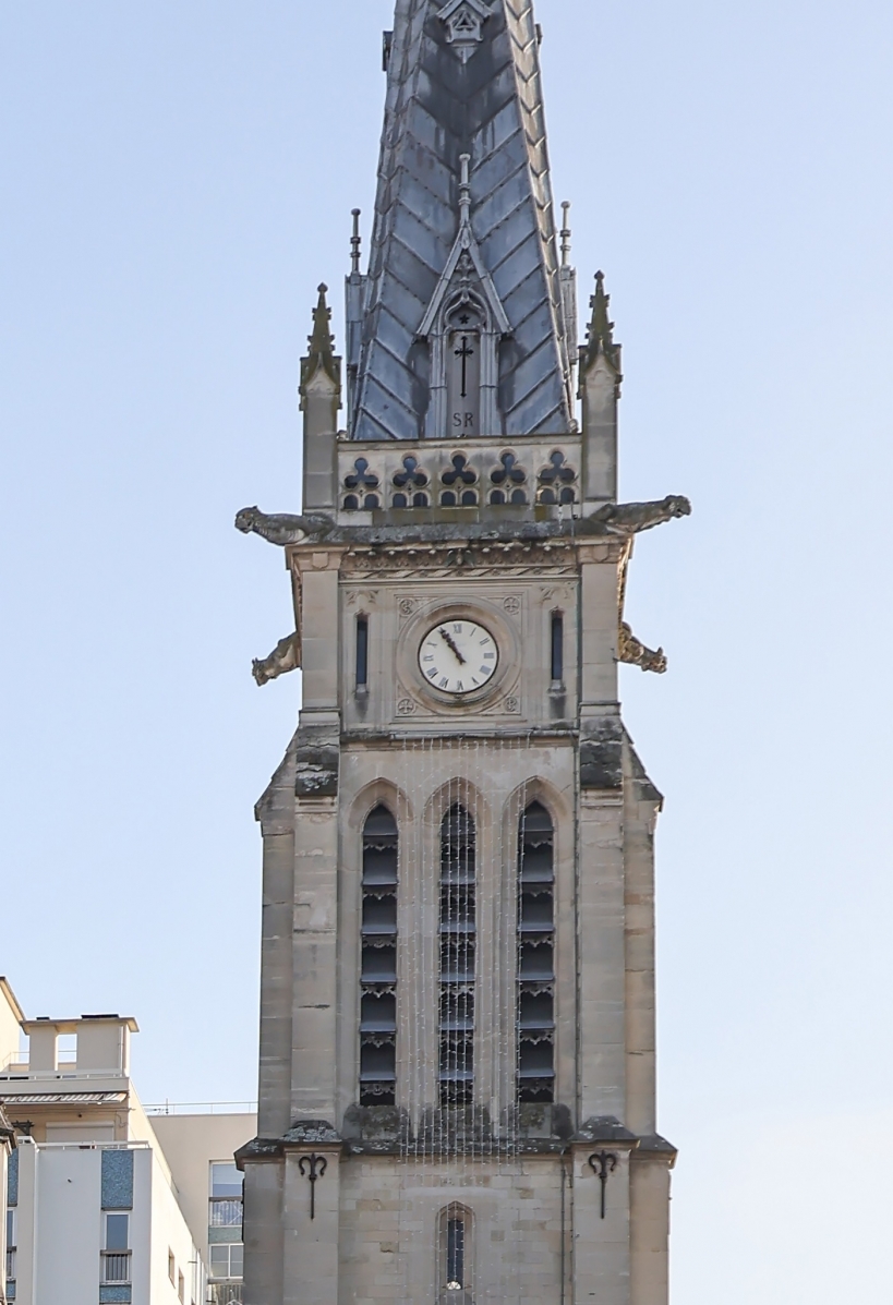 Occasion de rappeler que le clocher de cette église datant de1449 (XVe siécle) a fait l’objet de deux interventions très importantes : Tout d’abord en 1874, il a fallu carrément le reconstruire, l’église ayant beaucoup souffert des combats de la commune, et des obus versaillais : le bas-côté droit et la toiture de la nef ayant été gravement endommagé, le clocher avait été démoli. Les travaux furent vite menés, grâce à l’architecte Eugéne Monnier qui fit construire une tour surmontée d’un beffroi et d’une flèche qui ne manquait pas de charme. « La tour est ajourée à rez-de-chaussée sur deux de ses faces par des fenêtres ogivales et sur la troisième par une porte monumentale de forme ogivale. Les quatre faces de la tour sont épaulées chacune par deux contreforts et qui se prolongent jusqu’à la corniche supérieure. L’étage du beffroi est indiqué par les fenêtres gémisées garnies d’abas son, qui se répétent des quatre côtés de la tour. Au-dessus de cet étage et en attique, se trouve placé un cadran d’horloge. Une corniche décorée de feuilles d’acantes couronne cette partie de la tour, au-dessus, une balustrade en pierres découpées d’appuie contre les pinacles qui surmontent les contreforts. La flèche se divise en deux parties dans le sens de la hauteur, le premier étage est quadrangulaire et il est éclairé par 4 lucarnes. Le deuxième s’élève sur plan octognal, et il est ajouré sur chacun de ses pans par une fenêtre surmontée de pignon. La fléche se termine par une crosse latine » indiquait un rapport classé aux archives de l’Archevêché de Paris. Sa cloche avait été refondue dans la même forme et avec les mêmes inscriptions, et la municipalité avait même accepté de poser un paratonnerre dessus. L’horloge avait été remplacée, avec ses quatre cadrans en lave de Volvic. Dans le même temps, la place (de la République) avait été aménagée petit à petit dans le courant du dernier quart du XIXéme siécle grâce à la disparition de vieilles bâtisses et l’ouverture d’une nouvelle rue.